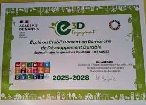 Ce jeudi 16 octobre, Mme FAUCHARD la directrice était accompagnée de M. BROSSET, maire de Tiffauges à la cérémonie de remise du label E3D (Etablissement en Démarche de Développement Durable) au lycée Aimée Césaire de Clisson. L’école était déjà labellisée de 2022 à 2025. Elle a renouvelé son label pour 3 nouvelles années. Ce label permet de mettre en lumière les projets en lien avec le développement durable qui sont travaillés au sein des classes. Cette reconnaissance est un juste retour du travail effectué par l’ensemble de l’équipe pédagogique avec les élèves.